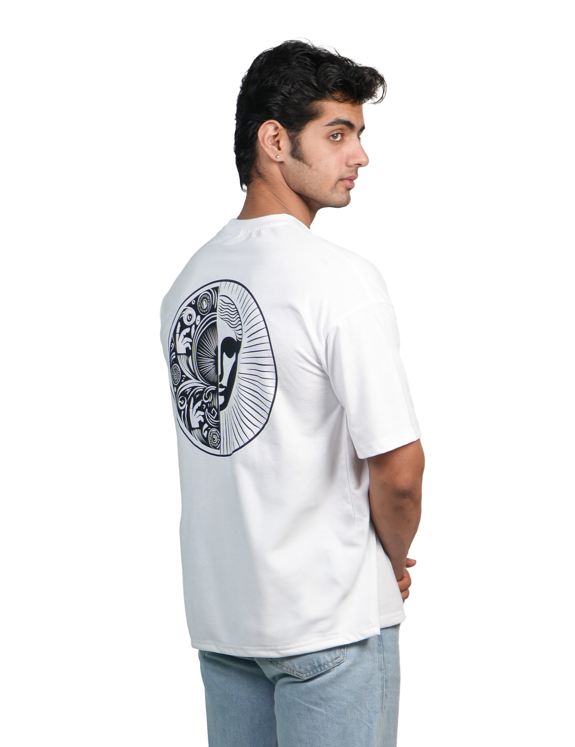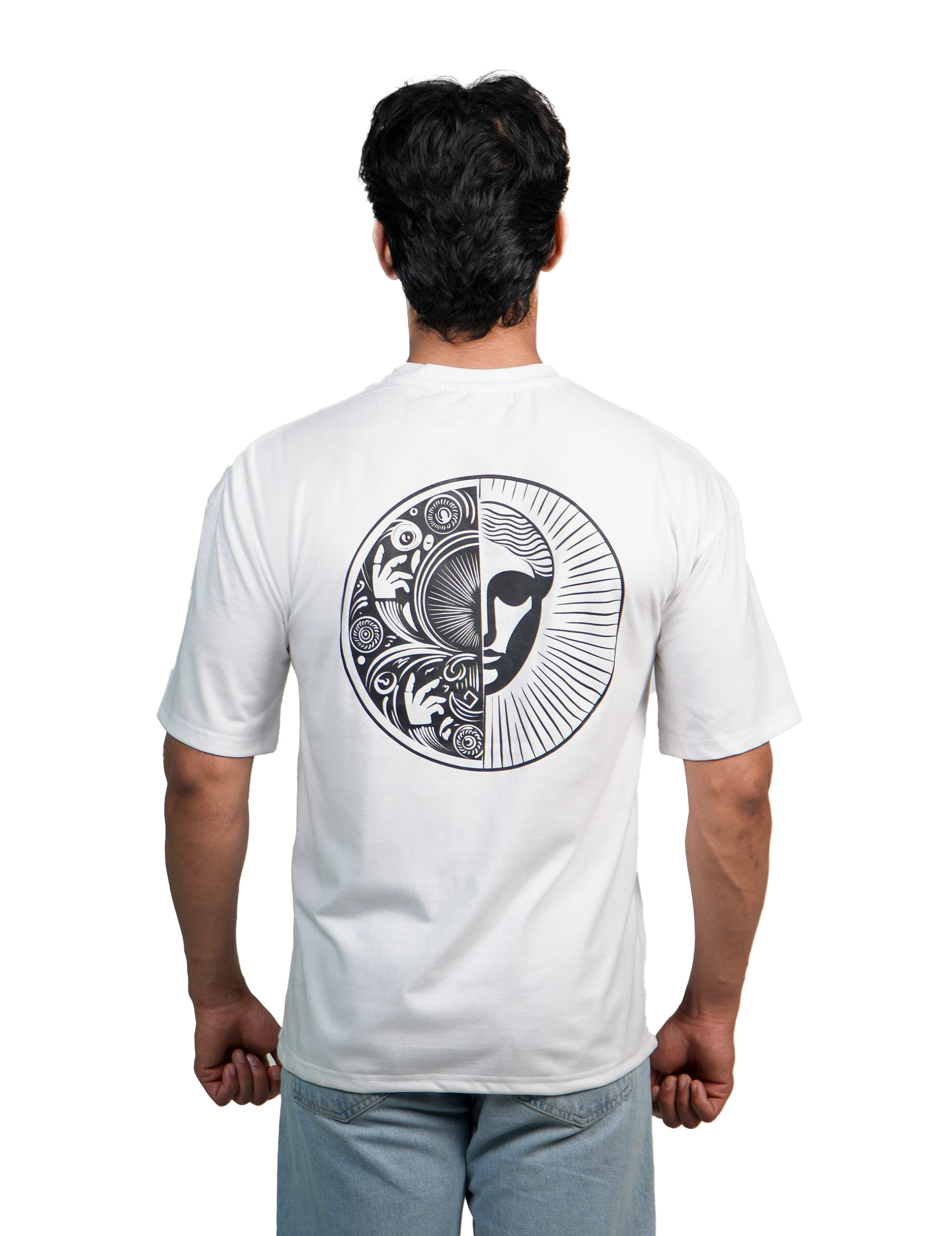 Our Signature Premium White Tee features handwritten Sanskrit script “Tat Tuam Asi” on the front and our exclusive duality mandala graphic on the back, where nature meets cosmic energy in perfect balance. reveal our signature duality mandala, where flowing botanical patterns merge seamlessly with radiating cosmic energy. This balanced visual meditation represents the harmony between natural and spiritual worlds—a perfect expression for those walking a conscious path while navigating modern life.